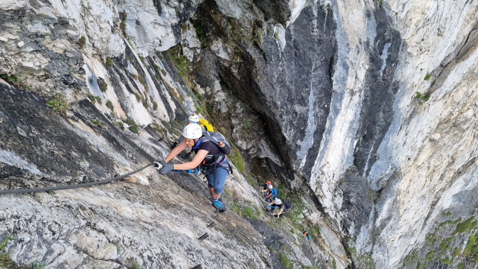 Ausgehend vom Parkplatz am Leopoldsteiner See geht es in ca. 15 min zum Einstieg des Klettersteigs. Diesem folgenden erklimmen wir die ca. 800 m hohe Seemauer. Die maximale Schwierigkeit (D) wird gleich an der Einstiegswand bei zwei kleinen Überhängen erreicht, aber auch später gibt es noch einige C/D Passagen. Optional kann im Anschluss noch der Rosslochhöhlen-Klettersteig (D/E) bezwungen werden. Der Klettersteig ist nicht für Anfänger geeignet. Trittsicherheit und Schwindelfreiheit sind erforderlich. Teilnahme ab 15 Jahren.